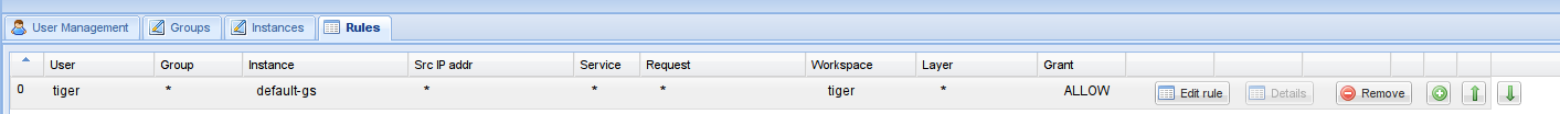 Get back to GeoFence, and add a rule which allows all layers in workspace tiger for user