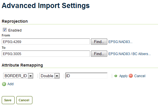 In addition, on this page attributes can be renamed and their type changed. Click on the Add link under Attribute Remapping to select the attribute to alter, its type, and its new name. Click Apply when done.