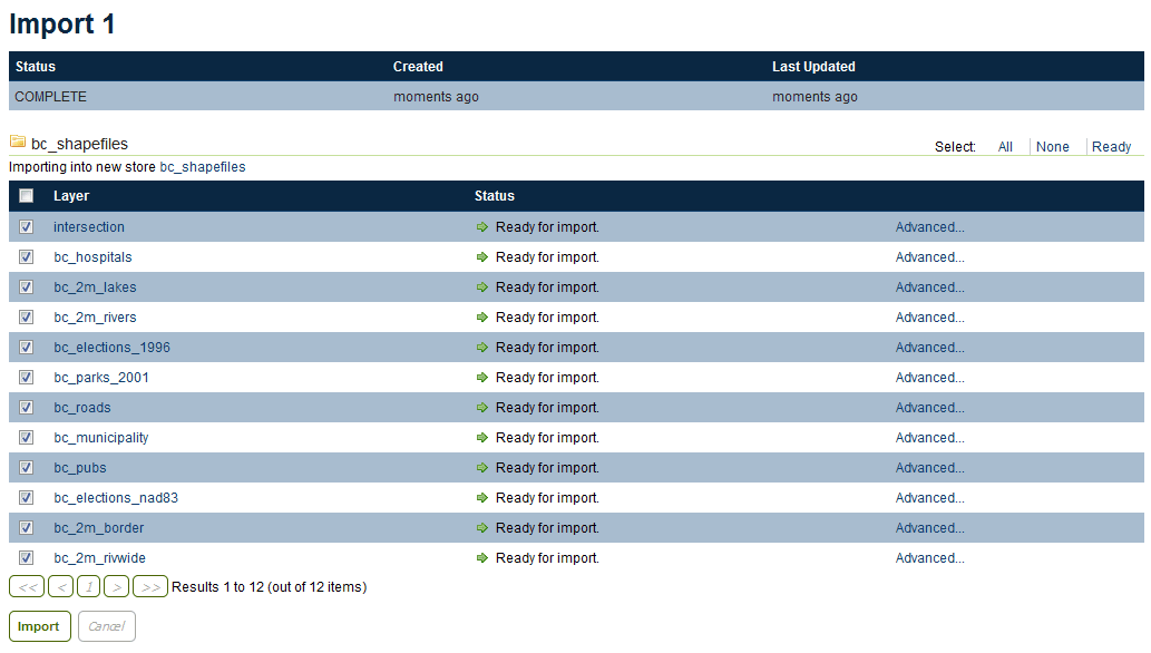 On the next page will be a list of layers found by the Layer Importer. The layers will be named according to the source content's name (file name of database table name). For each entry there will be a Status showing if the source is ready to be imported.