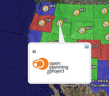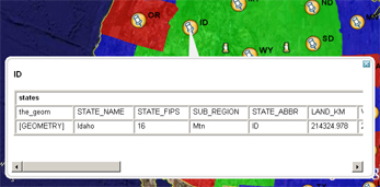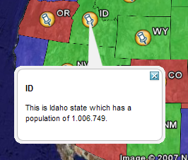 By default GeoServer produces placemark descriptions which are HTML tables describing all the attributes available for a particular feature in a dataset. In the following image we see the placemark description for the feature representing Idaho state: