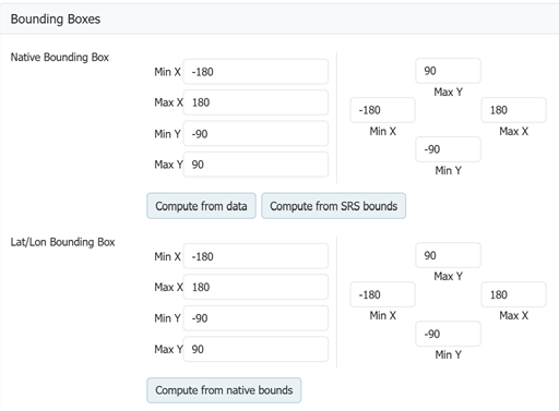 Locate Bounding Boxes and generate the layer's bounding boxes by clicking the Compute from SRS bounds and then Compute from native bounds links.