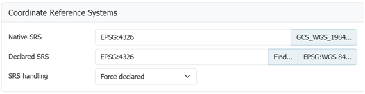 Force declaredto prefer the GeoServer internal EPSG database definition of WGS84 over theprjfile provided alongside the same image.Native SRS EPSG:4326Declaired SRS EPSG:4326SRS Handling Force declared