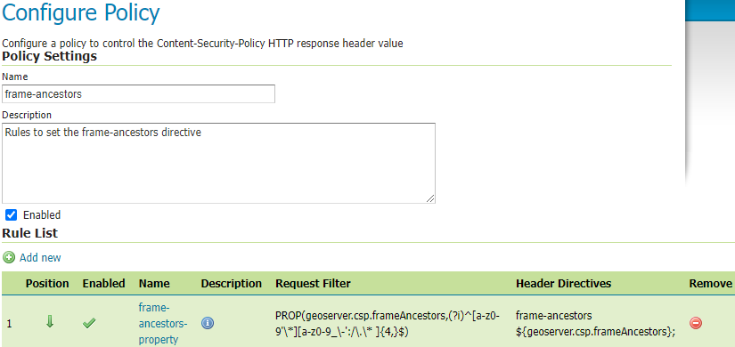 Use the Allowed frame-ancestors directive sources text field to control the sources of the frame-ancestors directive. This is intended to make it easier for administrators to allow specific remote hosts to load GeoServer content in frames. Only trusted hosts should be added here to prevent clickjacking attacks.