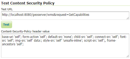 GeoServer gives administrators complete control over the CSP header directives and sources and does not attempt to parse or validate them so it is the administrator's responsibility to verify that the header is working as intended when modifying this field. See System Administrator CSP Settings for detailed information about valid Content Security Policy header directives and sources.