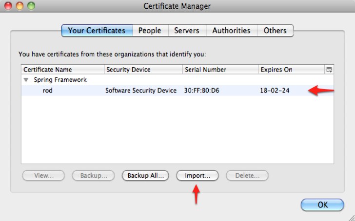 On the Your Certificates panel click the Import button and select the