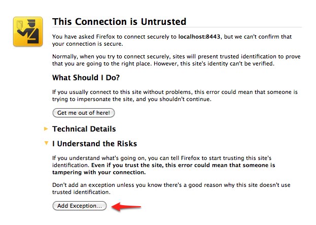 . When warned about the self-signed server certificate, click Add Exception to add a security exception.¶