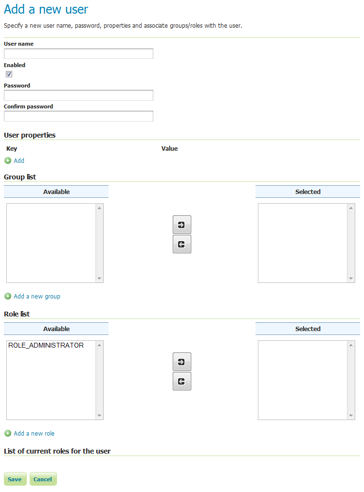 | Role list | Full list of roles, including a list of roles to which the user is associated. Association can be toggled here via the arrow buttons. |