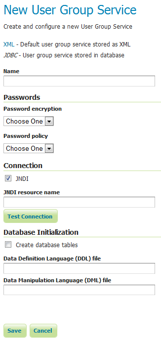 To add a new JDBC user/group service, click the Add new link, and then the JDBC option at the top of the following form. The following figure shows the configuration options for a JDBC user/group service.