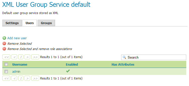 Once the new user/group service is added (either XML or JDBC), clicking on it in the list of user/group services will allow additional options to be specified, such as the users and groups associated with the service.