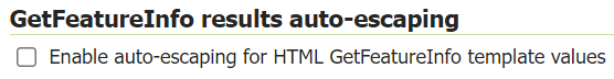 When the flag is checked, values that are printed in the HTML templates for GetFeatureInfo requests results will be automatically escaped. The default FreeMarker templates can be overridden to enable or disable auto-escaping on a per template, per block or per value basis.