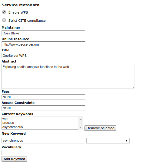 The Web Processing Service (WPS) page supports the basic metadata for the service, as well as service specific settings