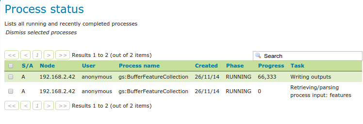 All executions listed in the table can be selected, and then dismissed using the "Dismiss selected processes" link at the top of the table. Unlike the "Dismiss" vendor operation this UI allows to also dismiss synchronous processes. Once the process dismissal is complete, the process execution will disappear from the table (in accordance with the WPS specification).