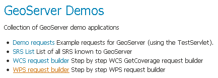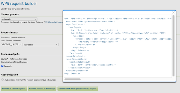 The GeoServer WPS extension includes a request builder for testing out WPS processes through the Web administration interface. This tool can also be used to demonstrate processes, and construct your own examples.