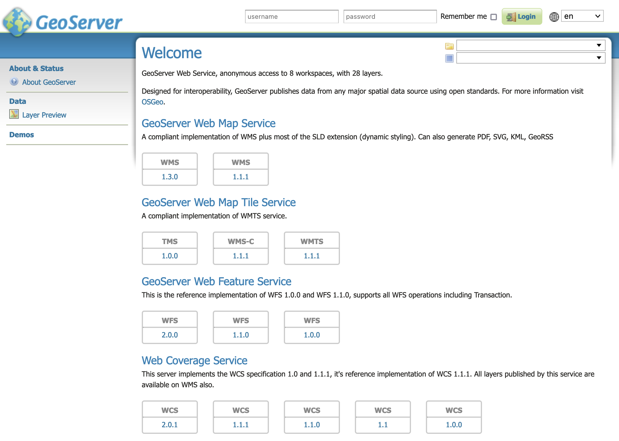 The Welcome Page lists the web services published by GeoServer for mapping, data access and processing.