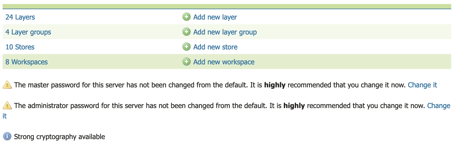 When logged in with administrative credentials a configuration overview is provided, along with any information or warning notifications.