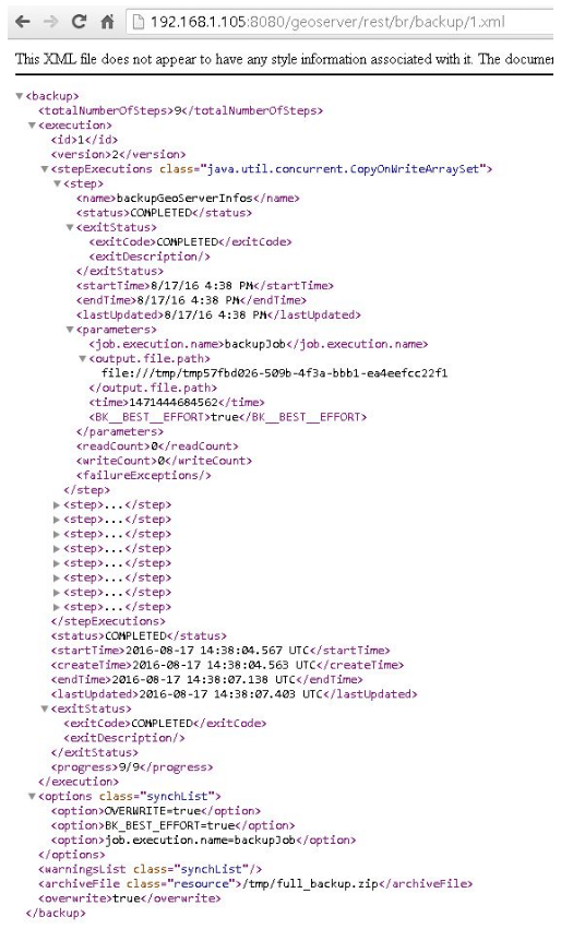 GeoServer will respond with the status of the backup job corresponding to that ID