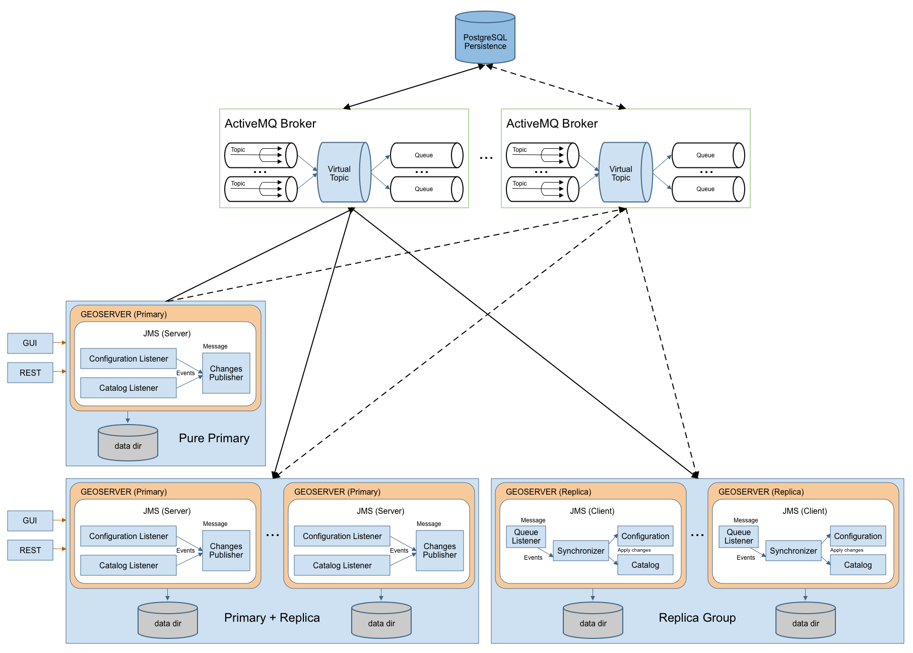 - A set of GeoServer which can work as both Primary and Replica. These instances can send and receive messages to/from the topic. They can work as Primaries (sending message to other subscribers) as well as Replicas (these instances are also subscribers of the topic).