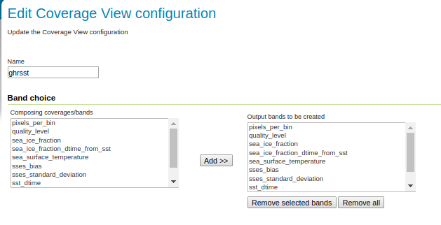 A GHRSST file contains multiple variables that are related with each other, and should be explored together in order to better understand the data. Thus, it is assumed that the source GHRSST file is published as a single coverage view holding all the variables as bands, retaining their native name (this is important for the plugin to work):