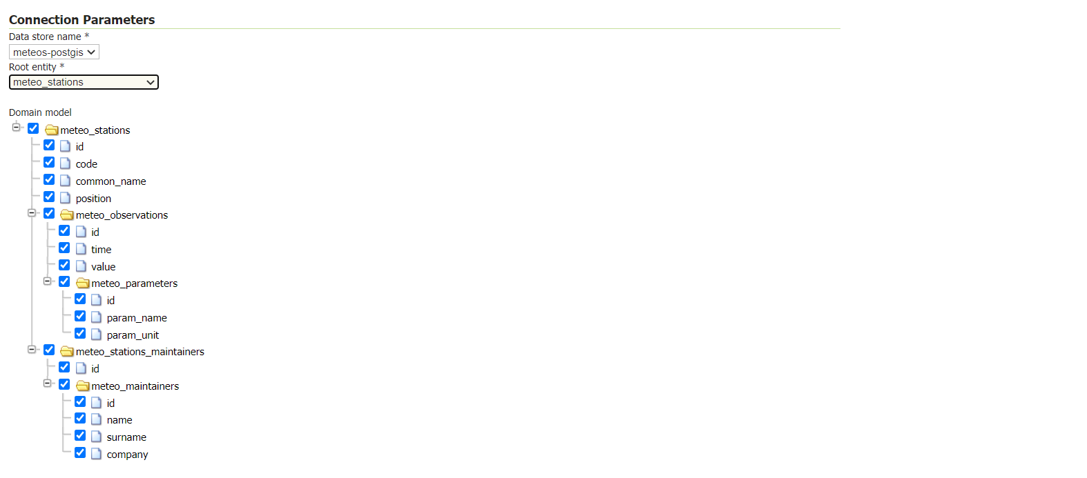 After having selected the root entity as meteo-stations, a schema, which will be used to generate the XSD and mappings file, will appear. Each attribute/entity can be unchecked to avoid it being included in the generated mappings.
