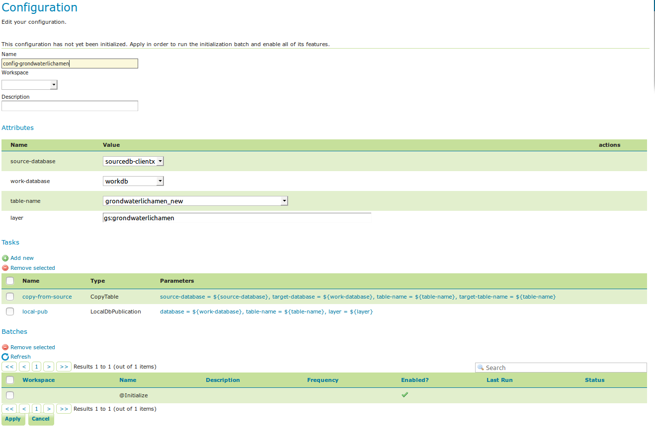 CopyTableTaskCopy a database table from one database to another. The user can specify a source database, source table name, target database and target table name. The source table name may also be a view. If the source does not contain a primary key column (f.e. if it is a view), an additional column 'generated_id', with an automatically generated primary key will be added to the destination table. The task will also copy all existing indexes. If the source table contains a geometry column but not a spatial index (f.e. if it is a view), a spatial index will automatically be added to the destination table. Supports commit/rollback by creating a temporary table.CreateViewTaskCreate a view based on a single table. The user can specify the database, the table name, the selected fields and (optionally) a where condition. Supports commit/rollback by creating a temporary view.CreateComplexViewTaskCreate a view based on a multiple tables. The user can specify the database and a whole query, where it can use any other configuration attribute in the form of '\${placeholder}'. Supports commit/rollback by creating a temporary view.CopyFileTaskCopy a file from one file service to another. Commit/rollback is supported by a versioning system, where the version of the file is inserted into the file name. The location of the version number is specified in the path as###(or set auto-versioned totrueto add the placeholder automatically before the extension dot). On commit, the older version is removed. On rollback, the newer version is removed. The publication tasks will automatically publish the latest version.LocalDbPublicationTaskPublish a database layer locally. The user can specify database, table and a layer name. Supports commit/rollback by advertising or removing the layer it created.RemoteDbPublicationTaskPublish a database layer to another geoserver. The user can specify a target geoserver, a source layer and a target database. All information is taken from the source layer except for the target database which may be different. Supports commit/rollback through creating a temporary (unadvertised) layer. This task also supports the version place holder or auto-versioning, in order to combine with theCopyFileTask.LocalFilePublicationTaskPublish a file layer locally (raster or shapefile). The user can specify a file service, a file (which can be uploaded unto the service) and a layer name. Supports commit/rollback by advertising or removing the layer it created.RemoteFilePublicationTaskPublish a file layer locally (taster or shapefile). The user can specify a target geoserver, a source layer and a target file service and path (optional). All information is taken from the source layer except for the file service and path which may be different. Supports commit/rollback through creating a temporary (unadvertised) layer.MetaDataSyncTaskSynchronise the metadata between a local layer and a layer on another geoserver (without re-publishing). The user can specify a target geoserver, a local and a remote layer. Does not support commit/rollback. If the target geoserver supports the Metadata Community Module native metadata attributes mapped to custom metadata attributes will be updated. Note that all of the publication tasks will synchronize metadata in the same way.ConfigureCachedLayerConfigure caching for a layer on a remote geoserver with internal GWC, synchronise the settings with the local geoserver. This task may turn caching on or off depending on local configuration.ClearCachedLayerClear (truncate) all tiles of a cached layer on a remote geoserver with internal GWC.LocalAppSchemaPublicationTaskPublish an Application Schema layer locally. This is exactly the same asLocalFilePublicationTaskwith the Application Schema mapping file as the file being published, and two additional features.- The mapping file may be provided as a template, with placeholders in the form of