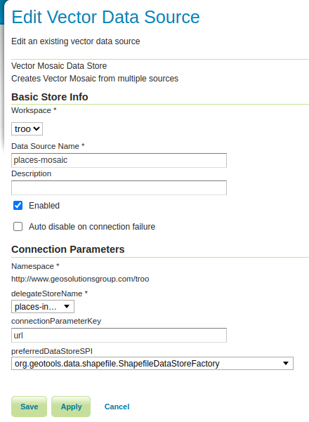 The delegate.shp shapefile can then be published as a store in GeoServer (no need to publish the layer), and then the mosaic store can be created, referencing to it: For example, let's say one downloads the TIGER shapefile for the PLACE theme, providing a shapefile with urban areas for each of the US states.