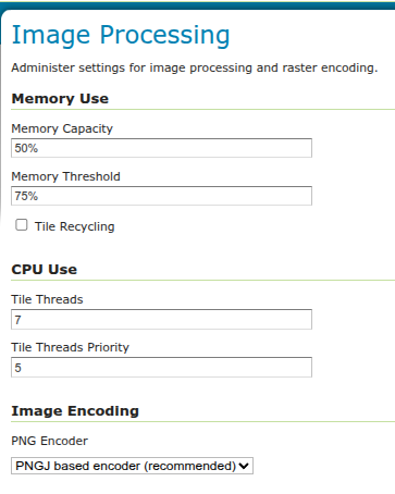 Several ImageN parameters, used by both WMS and WCS operations, can be configured in the Image Processing page.