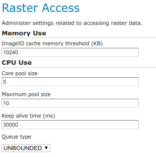 The Coverage Access Settings page in the Server menu in the Web administration interface provides configuration options to customize thread pool executors and ImageIO caching memory.