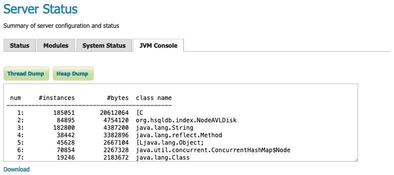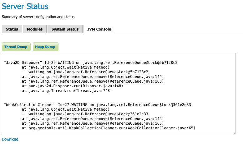 For information on the live Java Runtime Environment the JVM Console tab provides access to two useful troubleshooting tools.