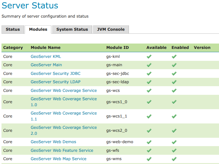 | Available | Whether the module is available to GeoServer. A database extension requiring a third-party database driver to be installed would not be available for use. |