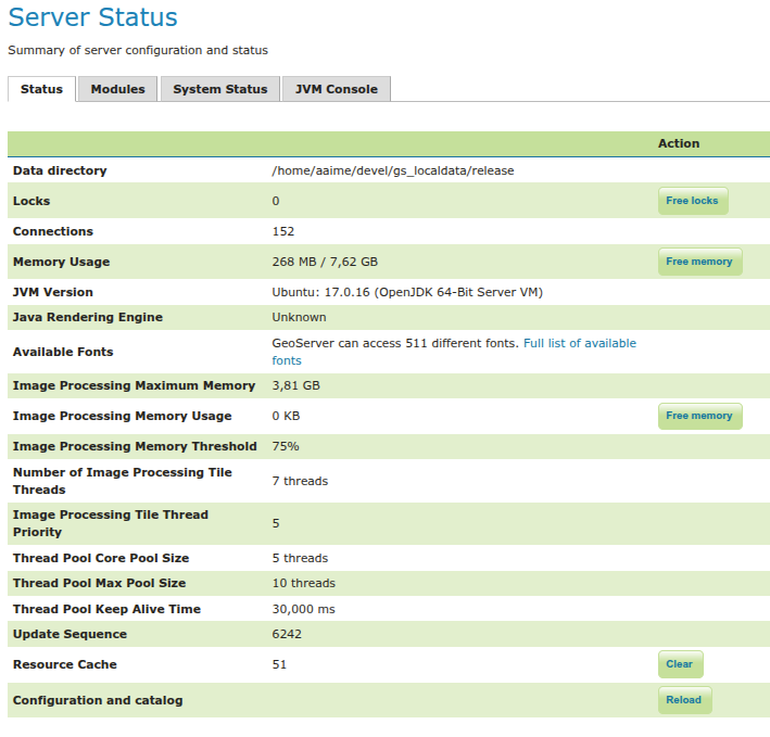 The System Status tab provides extra information about the system environment GeoServer is running in. This provides an overview of the status of the GeoServer instance.