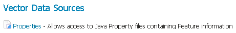 The Properties data store provides access to one or more feature types (layers) stored in Java property files; these are plain text files stored on the local filesystem. The Properties data store was never intended to be shipped with GeoServer. It originated in a GeoTools tutorial, and later found widespread use by developers in automated tests that required a convenient store for small snippets of data. It slipped into GeoServer through the completeness of the packaging process, and was automatically detected and offered to users via the web interface. The Property data store has proved useful in tutorials and examples.