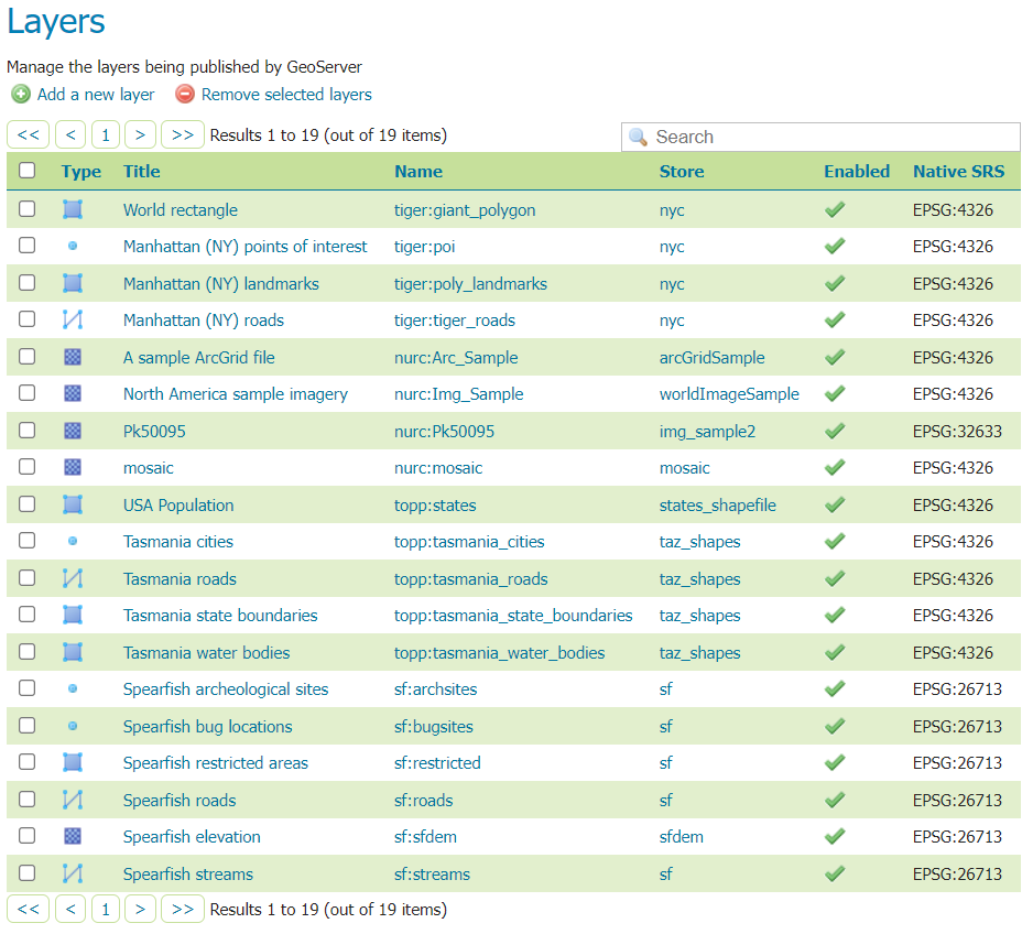 In the Layers section of the web interface, you can view and edit existing layers, add (register) a new layer, or remove (unregister) a layer. The Layers View page displays the list of layers, and the Store and Workspace in which each layer is contained. The View page also displays the layer's status and native SRS.