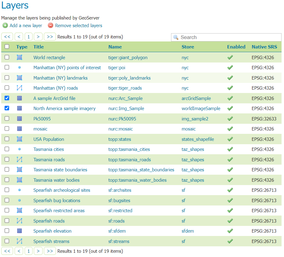 Upon selection of a Store, a list is displayed of resources within the store. Resources which have already been published as layers are listed first, followed by other resources which are available to be published. In this example, giant_polygon, poi, poly_landmarks and tiger_roads are all existing layers within the NYC store.