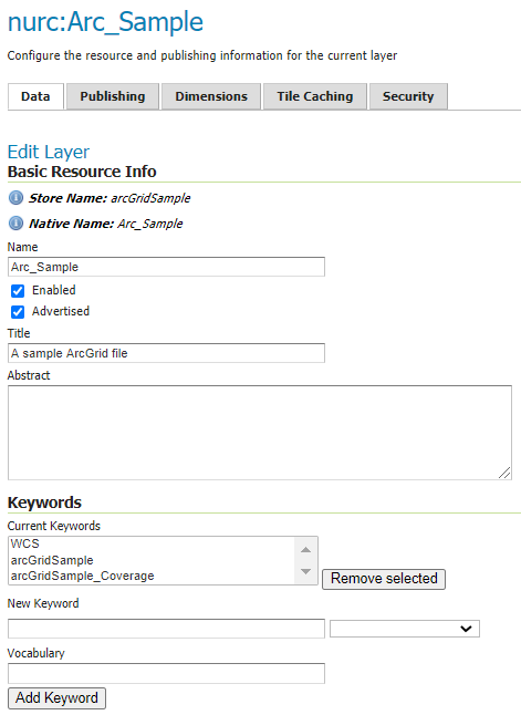 The beginning sections---Basic Resource Info, Keywords and Metadata link---are analogous to the Service Metadata section for WCS, WFS, and WMS. These sections provide "data about the data," specifically textual information that make the layer data easier to understand and work with. The metadata information will appear in the capabilities documents which refer to the layer.