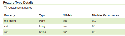 Vector layers have a list of the Feature Type Details. These include the Property and Type of a data source. For example, the sf:archsites layer shown below includes a geometry (the_geom) of type "point".