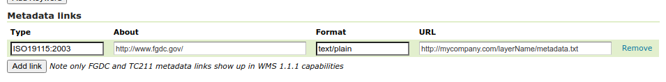 Metadata Links---Allows linking to external documents that describe the data layer. The "type" input provides a few example types, like FGDC or ISO19115:2003, but allows any other type to be declared. The optional "About" entry can be used to point to the definition of the metadata standard, or any other side information about it. Finally, "URL" points to the actual metadata, while "Format" provides its mime type.
