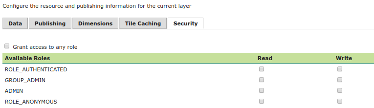 To create/edit layer's data access rules simply check/uncheck checkboxes according to desired access mode and role. The Grant access to any role checkbox grant each role for each access mode.
