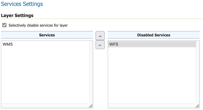 GeoServer publishes virtual_layer_services associated with each layer using the configuration provided by workspace services_, or default global services. This configuration includes enable/disabled setting that determines if a service is available.