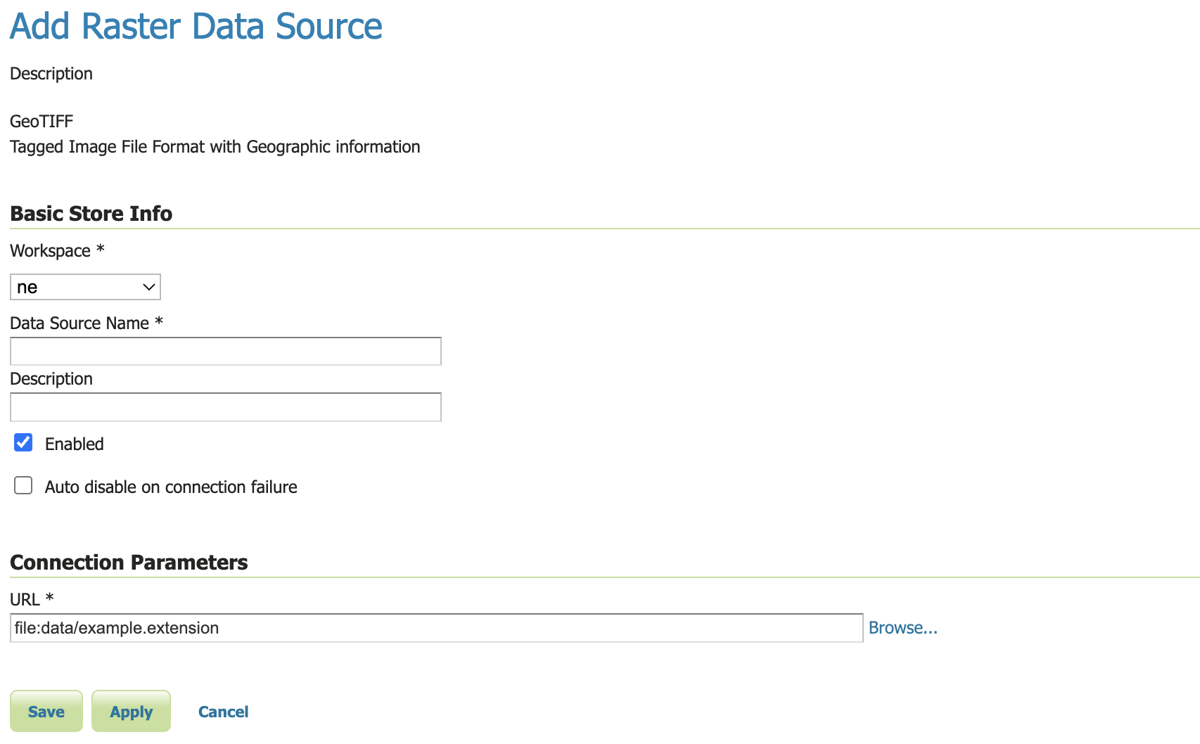 The next page configures the store. Since connection parameters differ across data sources, the exact contents of this page depend on the store's specific format. See the sections Vector data, Raster data, and Databases for information on specific data formats. The example below shows the GeoTIFF raster configuration page.