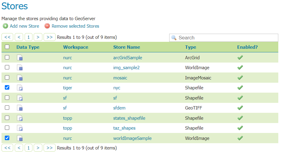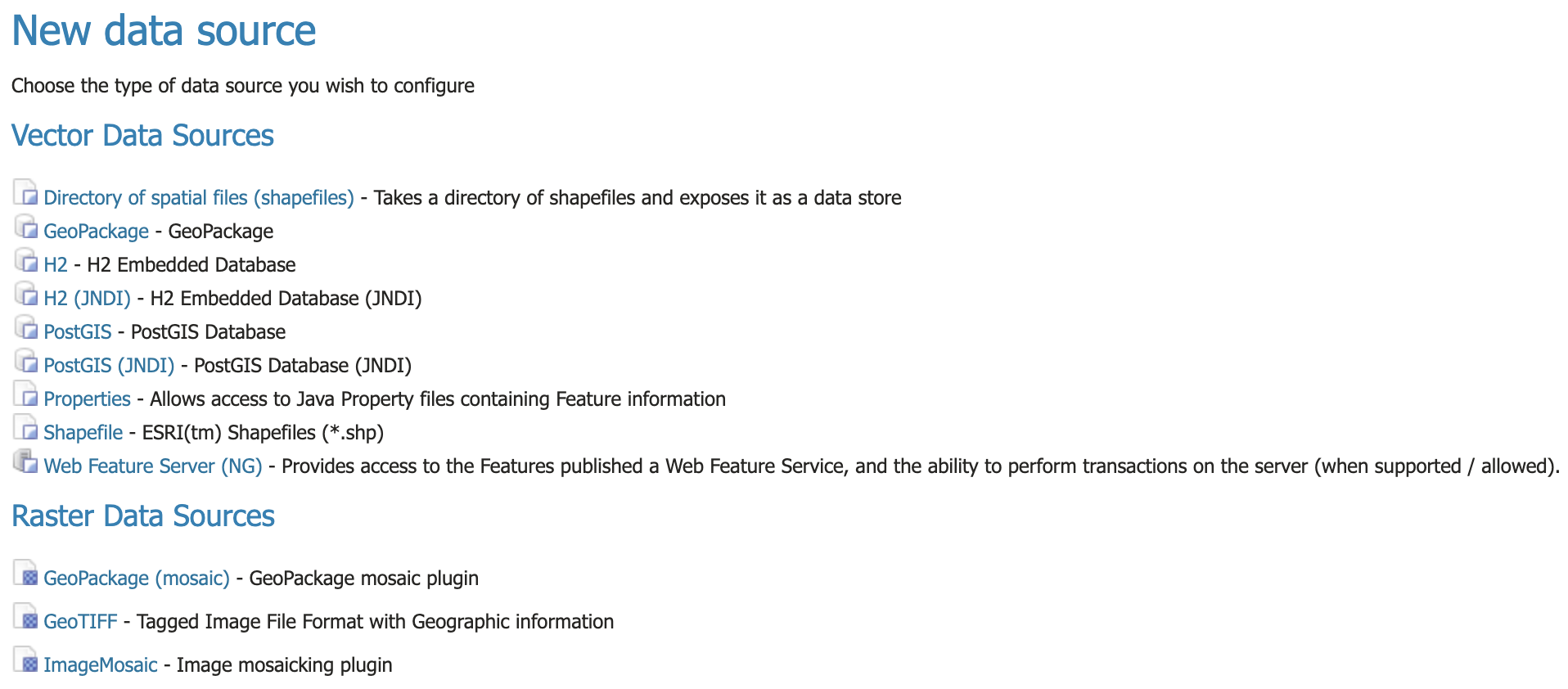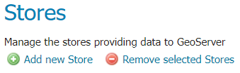 While there are many potential formats for data sources, there are only four kinds of stores. For raster data, a store can be a file. For vector data, a store can be a file, database, or server.