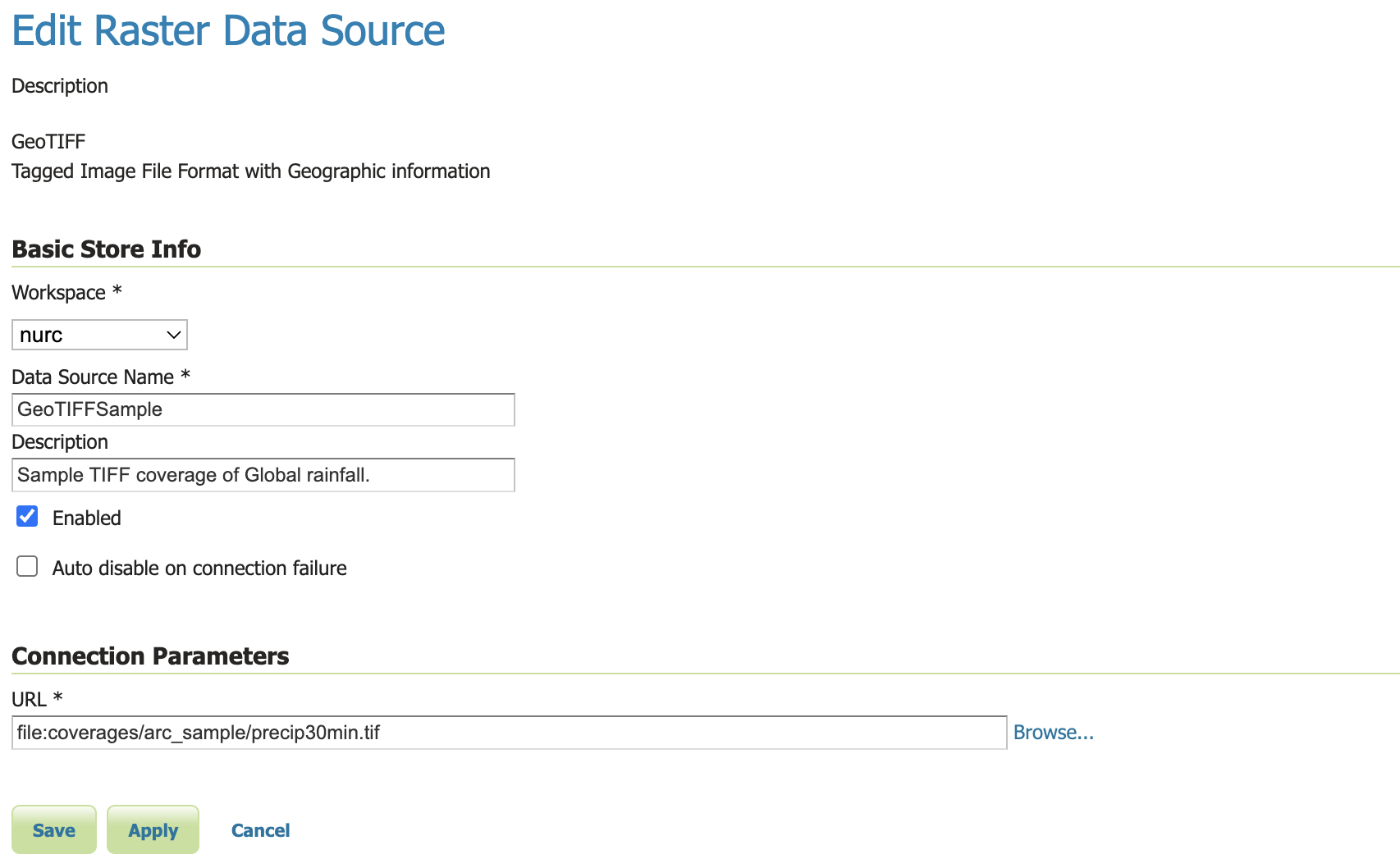 To view or edit a store, click the store name. A store configuration page will be displayed. The exact contents of this page depend on the specific format of the store. See the sections Vector data, Raster data, and Databases for information about specific data formats. The example shows the configuration for the nurc:GeoTIFFSample store.
