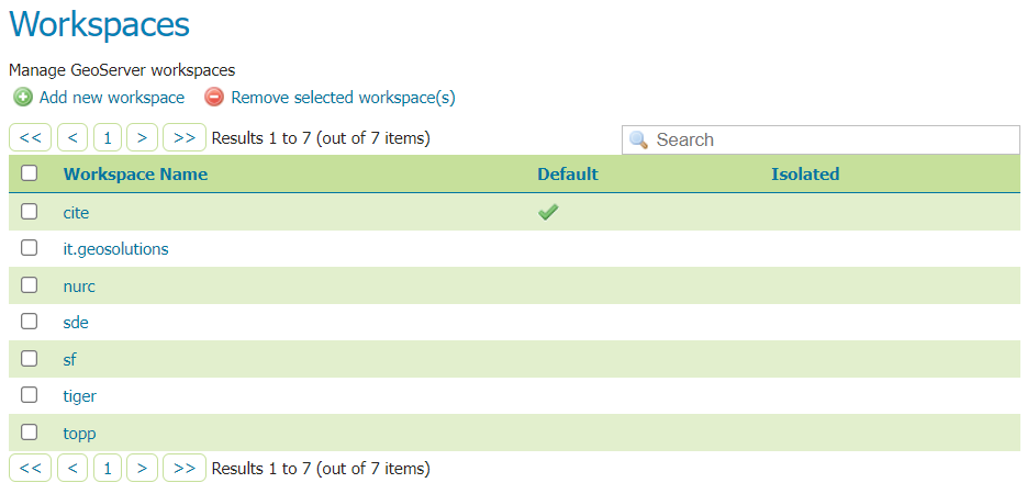 This section describes how to view and configure workspaces. Analogous to a namespace, a workspace is a container which organizes other items. In GeoServer, a workspace is often used to group similar layers together. Layers may be referred to by their workspace name, colon, layer name (for example topp:states). Two different layers can have the same name as long as they belong to different workspaces (for example sf:states and topp:states).