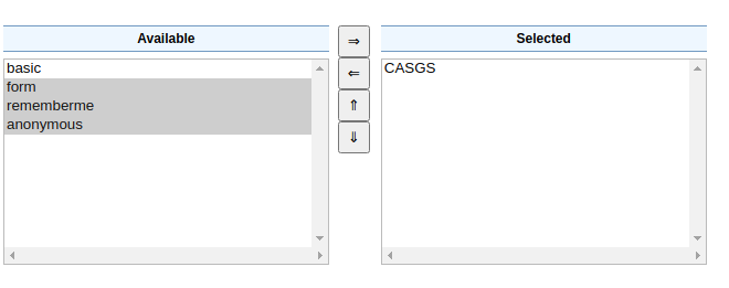 - Add it to the authentication chains, taking care of removing the other authentication methods (or the CAS authentication won't trigger and redirect users to the CAS login page)