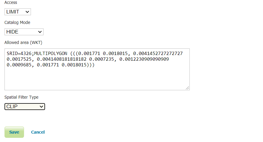 When Access type LIMIT is selected, additional options are displayed that allows the user to select the Catalog Mode and the Allowed Area (WKT) associated with this rule. The Spatial Filter Type parameter allows to define whether apply the Allowed Area filter to vector data as an Intersects or a Clip filter.