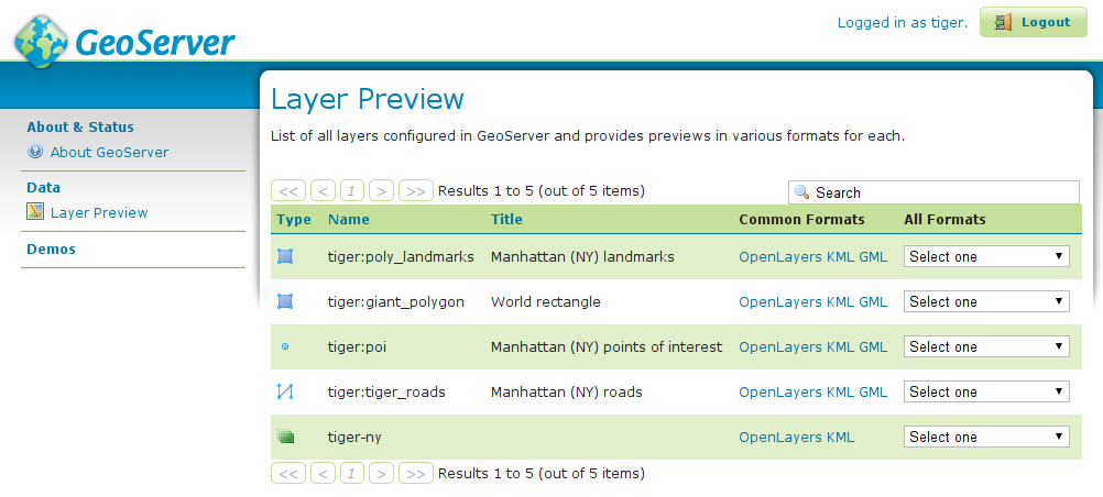 - Login again in GeoServer as user tiger and you will see in Browse Layers all the layers in the