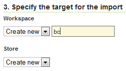 Alternately, select Create New and type in a names for a new workspace or store. During the import process, these will be created.