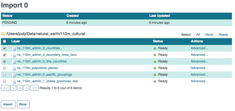 Recent import processes are listed at the bottom of the page. You may wish to visit these pages to check if any difficulties were encountered during the import process or import additional layers.