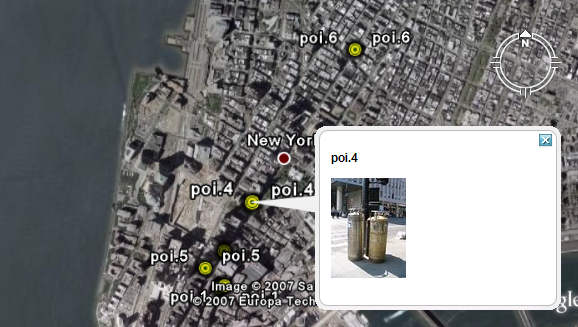 You will notice that hovering the mouse over one of the points on the map displays an image specific to that point. Let us replicate this with a KML placemark description.