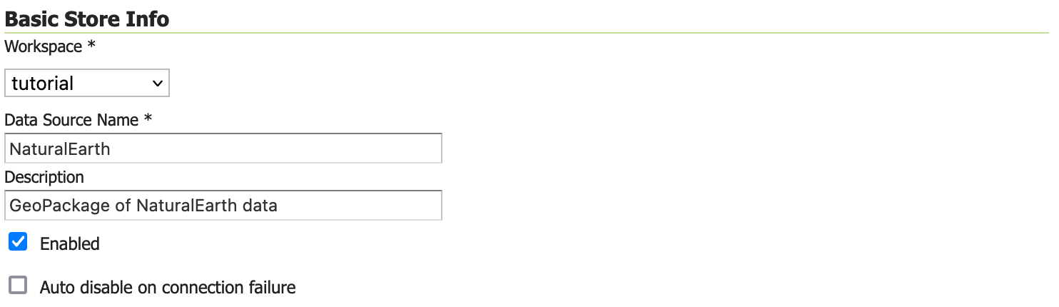 Field Value workspace tutorialData Source Name NaturalEarthDescription GeoPackage of NaturalEarth dataThis information is internal to GeoServer and is not used as part of the web service protocols. We recommend keeping the Data Source Name simple as they will be used to form folders in the data directory (so keep any operating system restrictions on character use in mind).