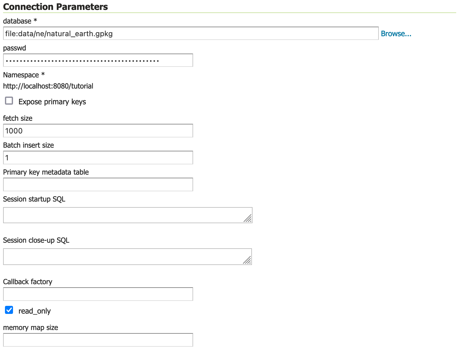 Field Value Database file:data/ne/natural_earth.gpkgRead only checked The use of read_only above indicates that we will not be writing to this GeoPackage, allowing GeoServer to avoid managing write locks when accessing this content for greater performance.